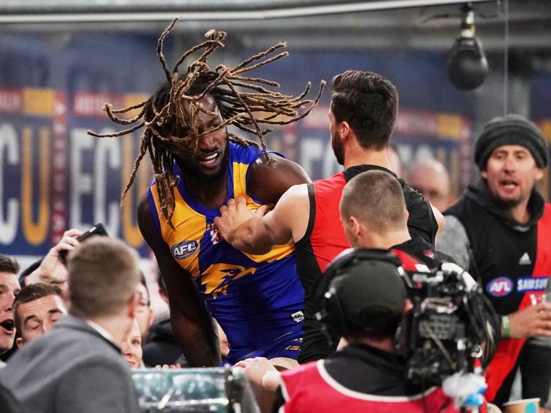 After Naitanui got his kick away, a melee developed after he shoved Merrett, who grabbed one of his dreadlocks.