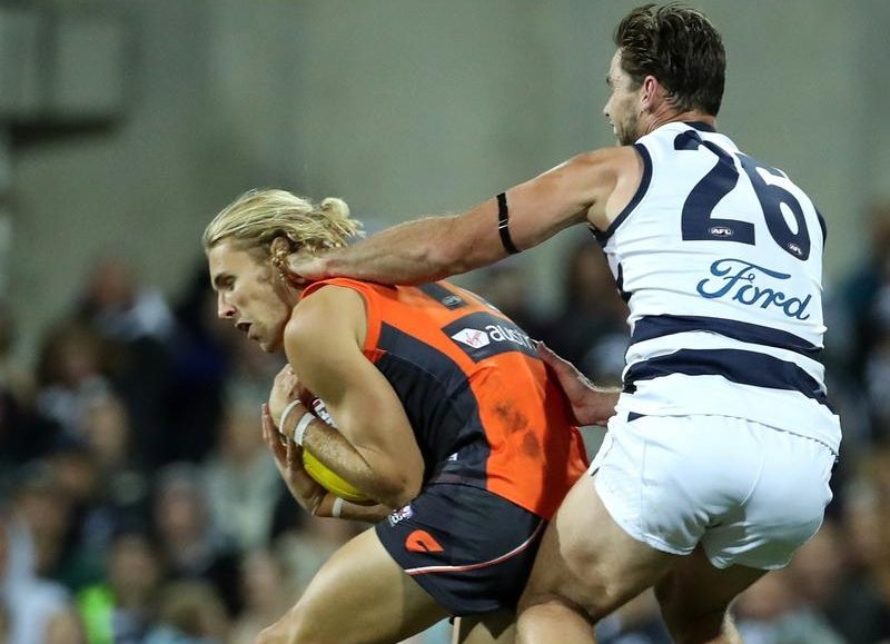 Hawkins was in outstanding form, with four goals in Geelong’s 61-point belting of the Giants.