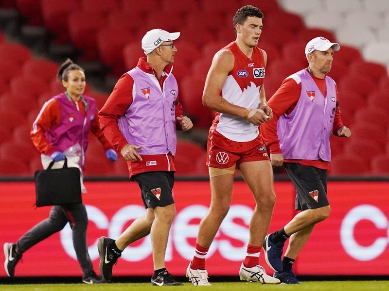 The 20-year-old landed heavily in a marking contest during the final quarter of the Swans 11-point win over North Melbourne at Marvel Stadium on Saturday.