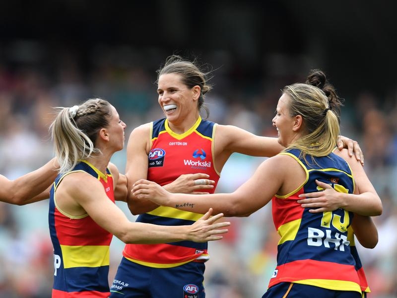 Adelaide’s Danielle Ponter (three goals) and Chloe Scheer (two goals) were ever-present attacking threats and ruck Jessica Foley was busy with 19 disposals, 16 hitouts and a goal.