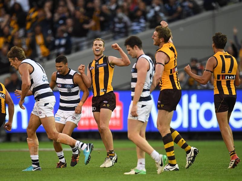 Geelong’s vaunted superstar trio have played together for the first time but Hawthorn spoiled the party with a stunning one-point win in an Easter Monday classic at the MCG.