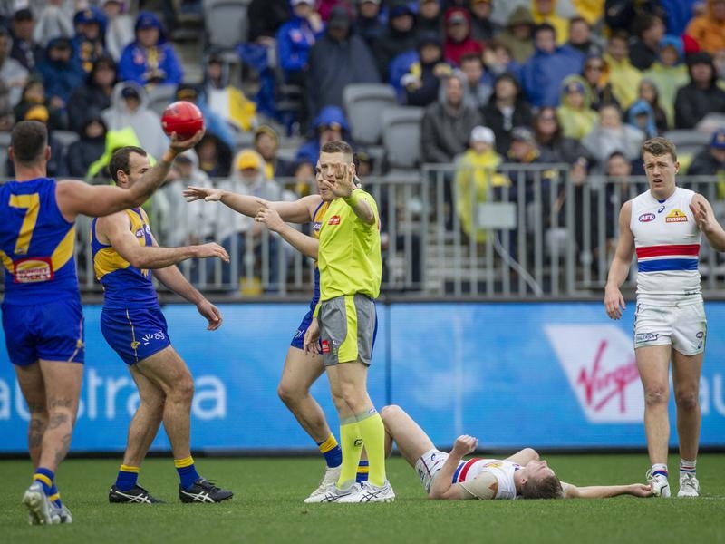 Western Bulldogs midfielder Mitch Honeychurch was taken to hospital to undergo scans on his neck after copping a high bump from Shannon Hurn in West Coast’s 54-point win on Sunday.