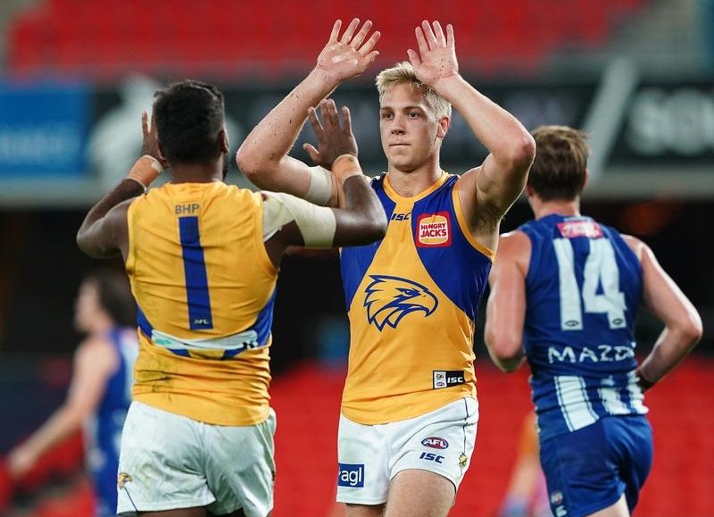 Oscar Allen, Liam Ryan and Liam Duggan did enough to help ensure a 7.7 (49) to 4.10 (34) victory at Metricon Stadium that saw the Eagles move up to third spot on the ladder.