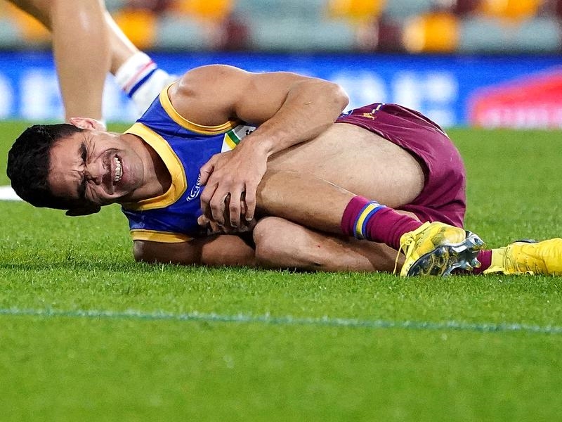The All-Australian forward lay clutching his left knee and hobbled off the playing arena with trainers.