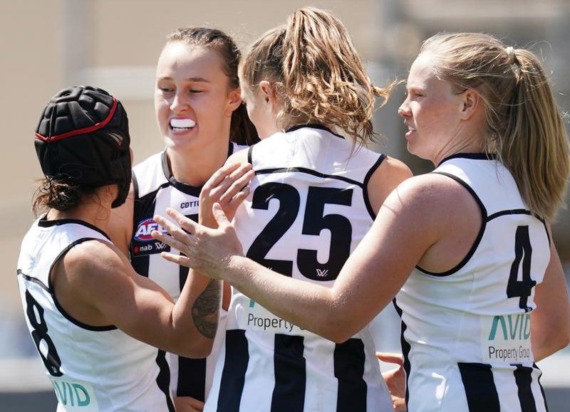 Collingwood forwards Jordan Membrey (two goals and 11 disposals), Aishling Sheridan (one goal and 14) and Jordyn Allen provided D’Arcy with sound support, while Stacey Livingstone (15 disposals) kept star Carlton forward Tayla Harris quiet.