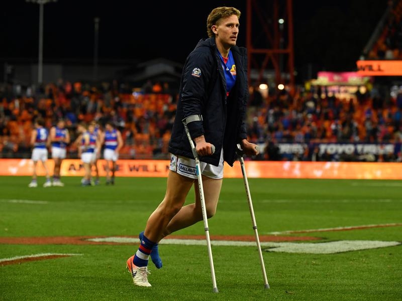 Naughton appeared in significant pain as he was helped to the bench and was on crutches wearing a heavy leg brace soon after the Dogs’ season ended with the 58-point defeat.