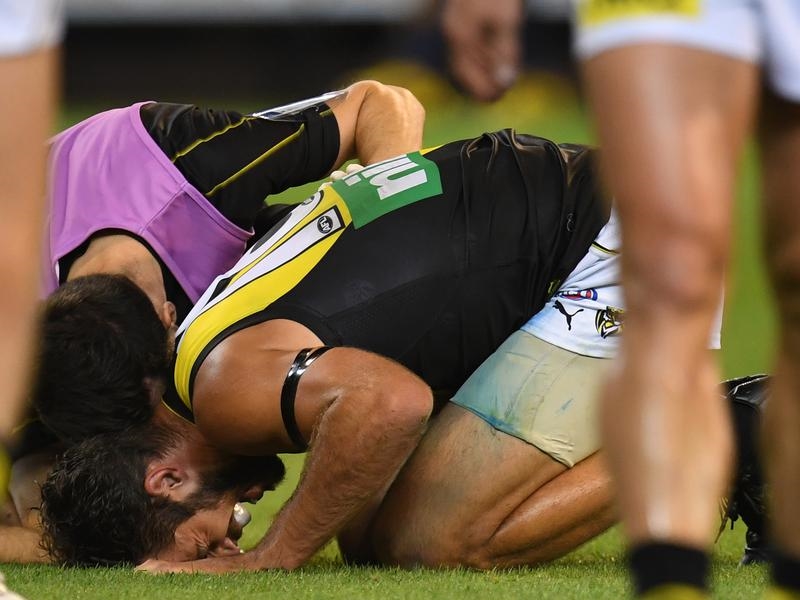 The contact left Riewoldt on his haunches and needing medical attention, but he played out the game.