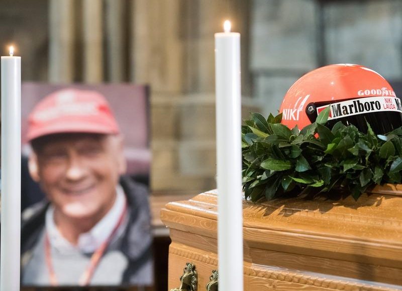 Members of Lauda’s family accompanied pallbearers carrying his remains into the gothic cathedral in the morning. His wife Birgit and two of his sons placed Lauda’s red-and-white driver’s helmet on the casket.