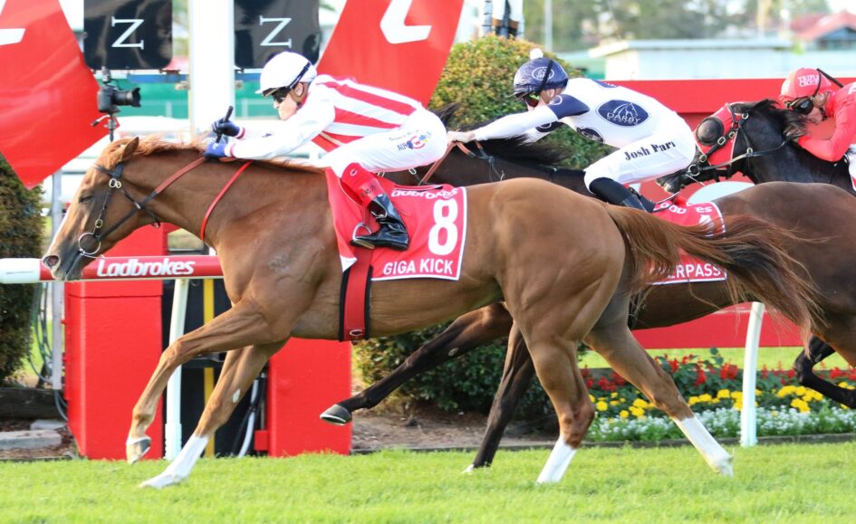 Australia’s latest sprint star Giga Kick has taken his winning roadshow to Brisbane, stamping his class on the Doomben 10,000 with a narrow but decisive victory.
