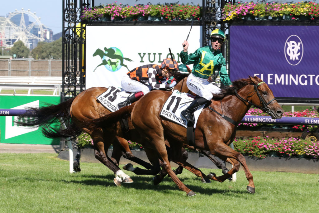 Giving jockey Patrick Moloney his first Group 1 success, Roch ‘N’ Horse ($101) scored by a long neck from The Astrologist ($61) with September Run ($26) a half-neck away third.