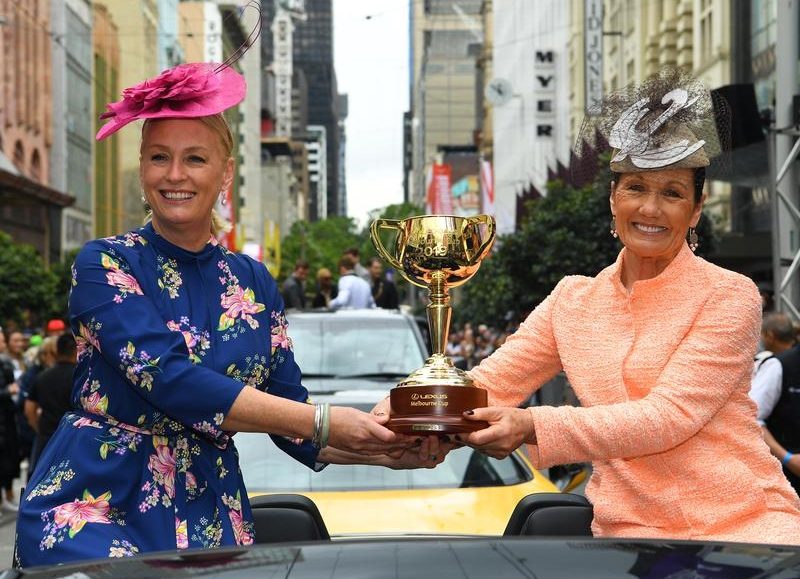 Melbourne Lord Mayor Sally Capp and Victoria Racing Club chairman Amanda Elliott carried the $200,000 Cup trophy during the parade.