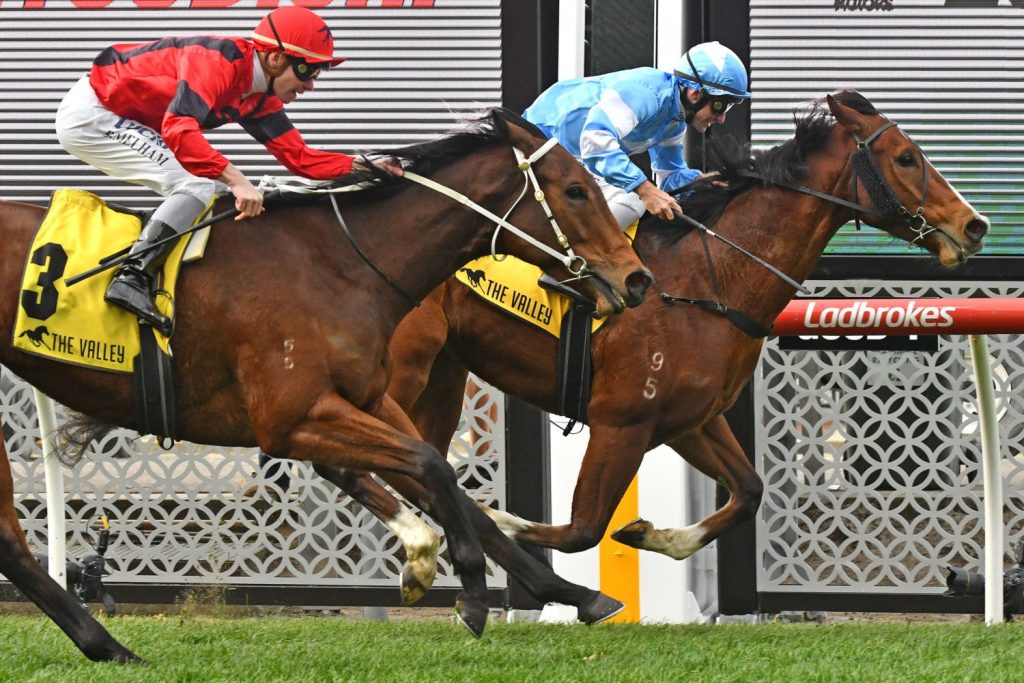 Favourite All In Brawl ($3.30) made his run on the outside to burst to the front before Mig Energy drove through on his inside to beat him by a neck.