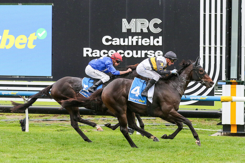 A significant weight drop has paved the way to Here To Shock landing a second win in Stakes company producing a strong finishing burst at Caulfield.