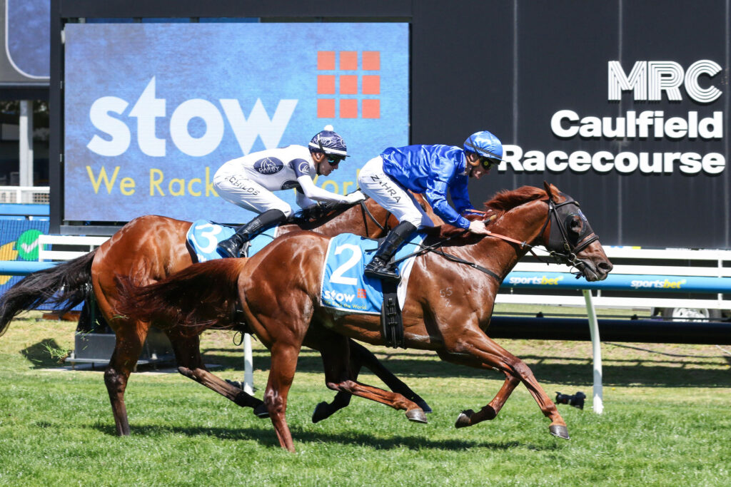 After returning overweight and underdone when third first-up in the Danehill Stakes (1100m) at Flemington on September 13, Tentyris took a big step forward at Caulfield. Settled back in the field by jockey Mark Zahra, the $2.25 favourite unleashed a powerful burst late to overhaul Raging Force ($4.40) and score by a long neck, with Sheeza Alibi ($16) another 1½ lengths away in third.