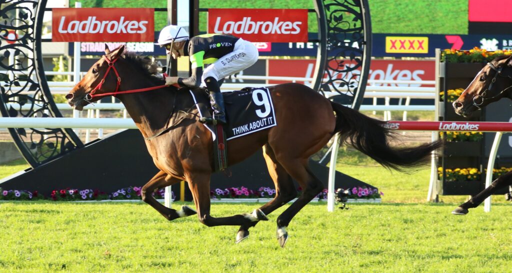 Think About It, who is carries the black and lime colours of Proven Thoroughbreds, atoned for that syndication company’s unlucky Stradbroke second placing with Private Eye 12 months’ earlier with his win.
