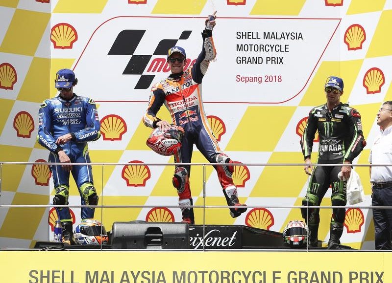 Last month in Japan, Marquez wrapped up his fifth world title with three races to spare, but looked like having to settle for second in front of almost 104,000 fans on Sunday at the Sepang International Circuit.