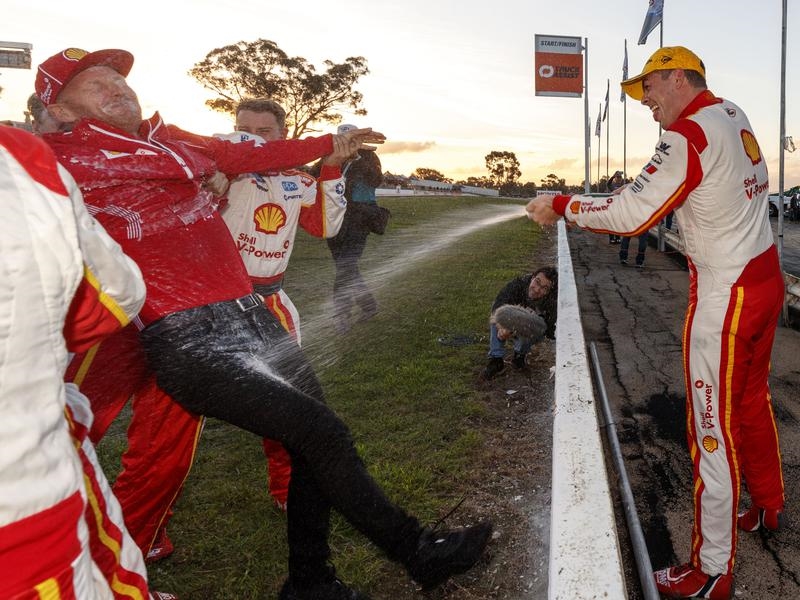 Saturday’s win wasn’t straightforward with McLaughlin having to overcome a first-lap tangle with teammate Fabian Coulthard which caused both of their Mustangs to run off the track.