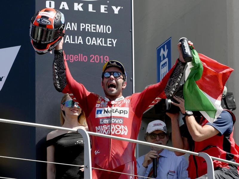 Ducati’s Danilo Petrucci claimed his maiden MotoGP victory in front of his home supporters at the Italian Grand Prix in Mugello – but Australia’s Jack Miller crashed out of the race.
