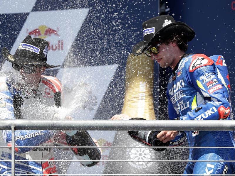 Spaniard Alex Rins has celebrated a surprise first MotoGP victory in Texas with Australian Jack Miller taking third as world champion Marc Marquez crashed out, ending a six-year winning streak at the Circuit of the Americas.