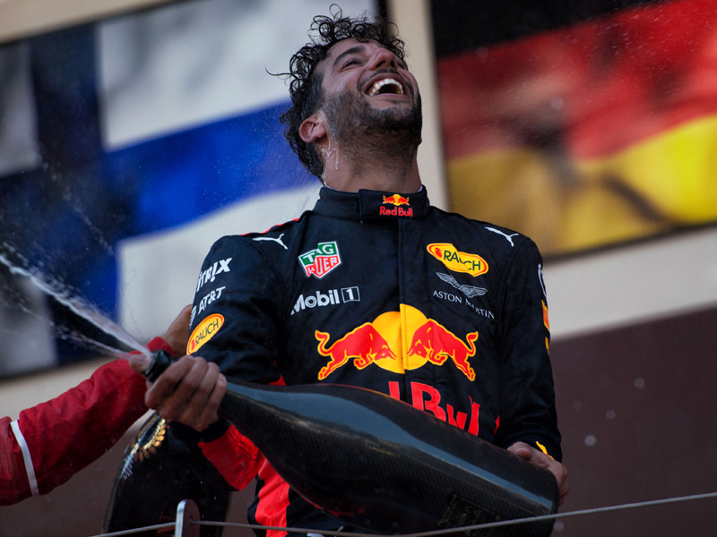 After gaining his second consecutive podium for the season the Australian was in a jovial mood post-race, even braving flicking water at a dejected Kimi Raikkonen in the press conference – all the while, grinning, always grinning.