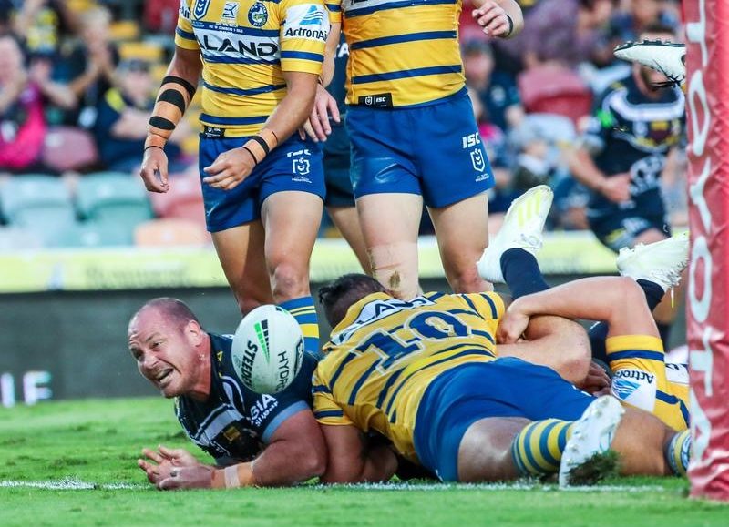 The Eels struck back via Brad Takairangi off a Kahu in-goal error, to create a halftime deadlock though the Cowboys could have found themselves well ahead.