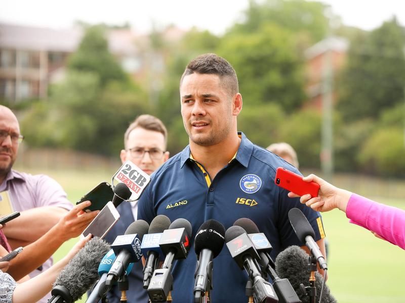 Hayne attended Wednesday’s media opportunity supported by Eels coach Brad Arthur and long-time mentor Joe Grima.