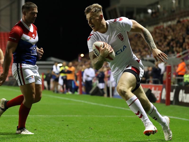 Connor, who kicked five first-half conversions, scored England’s only try in the second half in spectacular fashion, leaping off balance to gather and touch down Myler’s kick, and Mark Percival added the goal.