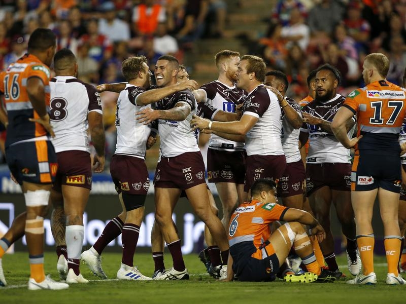Manly have condemned Newcastle to their fourth-consecutive NRL loss, holding on to win 26-18 despite prop Addin Fonua-Blake being sin-binned late in the match for flooring Mitchell Pearce.