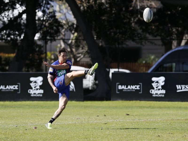 Mitchell Pearce was one of two players left on the track, practising his kicking game with under-20s halfback Phoenix Crossland.