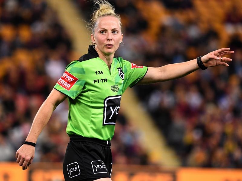 Sharpe’s milestone comes after she and Kasey Badger were promoted to the full-time NRL referees squad at the start of the year.