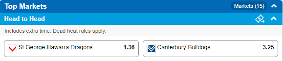 TabSportsbet: Dragons $1.37 Bulldogs $3.10
