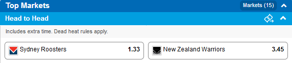 Unibet Odds: Sydney Roosters $1.34 New Zealand $3.35