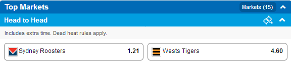 Tab Sportsbet: Roosters $1.21 Tigers $4.60
