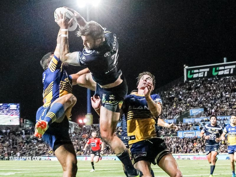 Feldt’s hat-trick came four minutes after the break when Clifford kicked behind Corey Norman and Jennings and as the Eels pair looked to guide the ball out of bounds, the Cowboy ran around them to touch down.