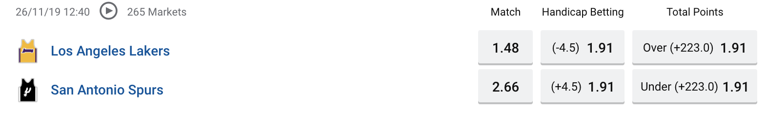 The NBA game between the Los Angeles Lakers and San Antonio Spurs will be on Tuesday (26/11/2019) at 12:30PM AEDT and we take a look at the odds for both teams. The Pacers go into the game as favourites.