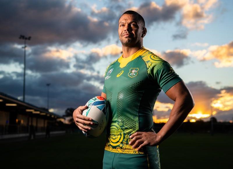 The indigenous star on Thursday modelled the Wallabies’ alternate strip, which they will wear in their World Cup pool game against Uruguay and in a potential semi-final in the Japan tournament in September.