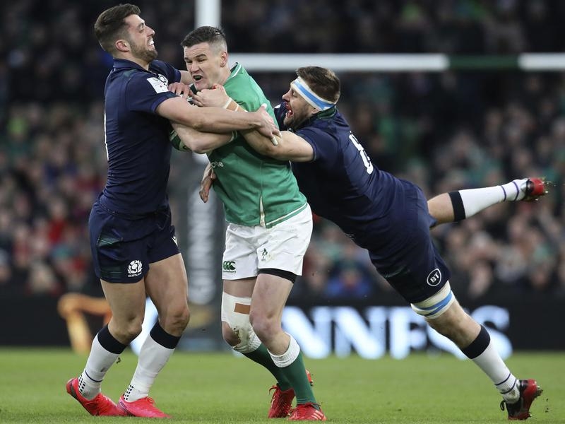 A try, conversion and penalty from new captain Jonathan Sexton edged an at times intrepid but very scrappy Ireland into a 10-6 halftime lead on Saturday, and he kept them in front in a second half that Stuart Hogg will want to forget after he fumbled an easy try.