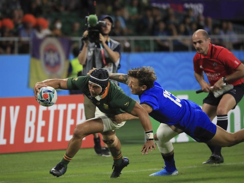 The ever-dangerous Cheslin Kolbe scored a try in each half and Bongi Mbonambi, Lukhanyo Am, Makazole Mapimpi, RG Snyman and Malcolm Marx also crossed to comfortably earn the twice World Cup winners a bonus point.