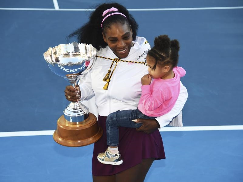 The American great was resplendent on Auckland’s centre court on Sunday after winning the ASB Classic, carrying the trophy in one arm and her daughter, Alexis Olympia Ohanian Jr, in the other.