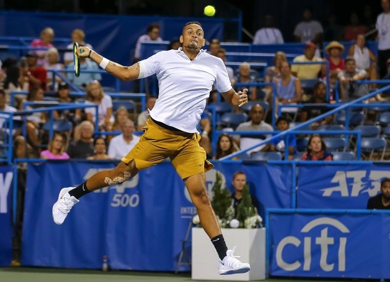 Nick Kyrgios has powered into the quarter-finals of the Washington Open after a typically temperamental performance against Japan’s Yoshihito Nishioka.