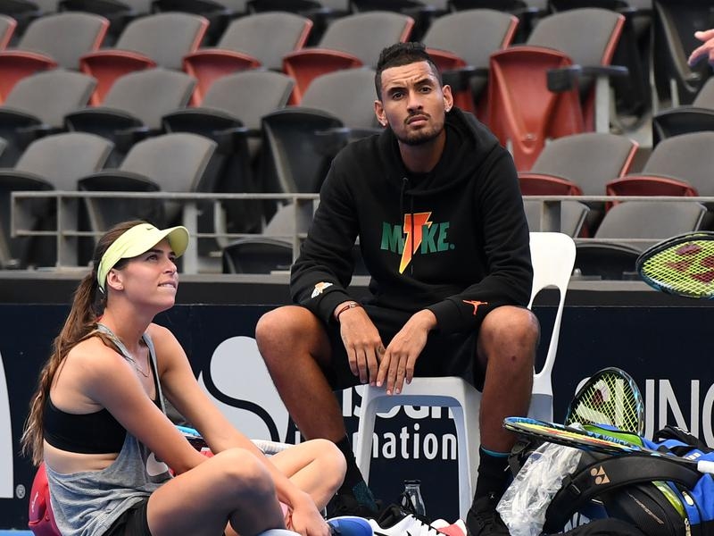Nick Kyrgios may not have a coach, but he seems to have locked in a hitting partner in girlfriend Ajla Tomljanovic after the pair traded groundstrokes at Pat Rafter Arena.