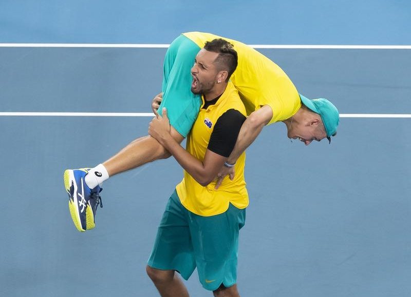 Admitting to being flat during the deciding rubber, Australian No.1 de Minaur said Kyrgios “carried” him during the match before literally doing so after a tense win where they saved four match points.